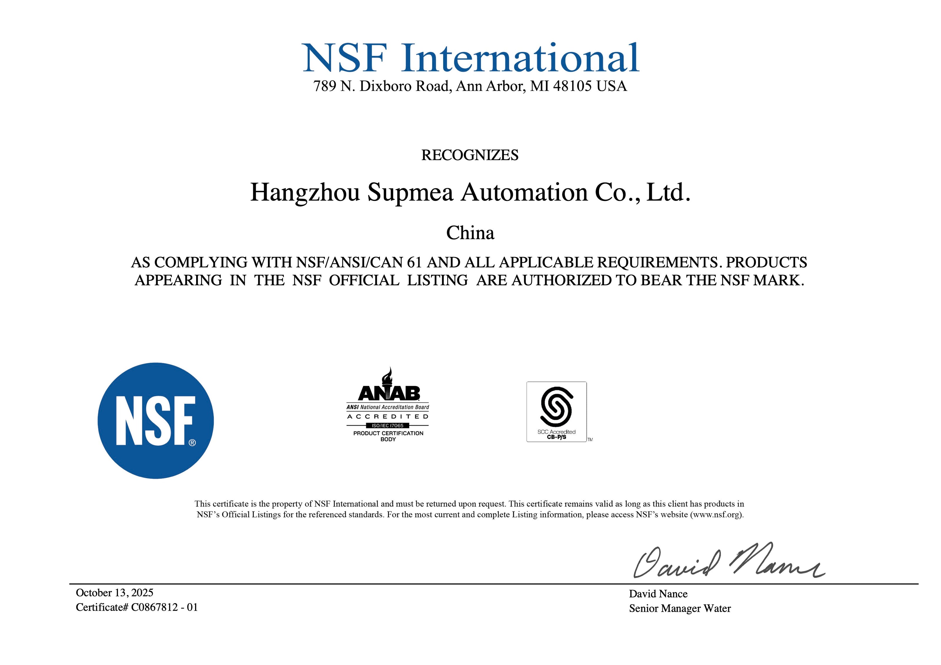 NSF/ANSI/CAN 61 certificate – electromagnetic flowmeter